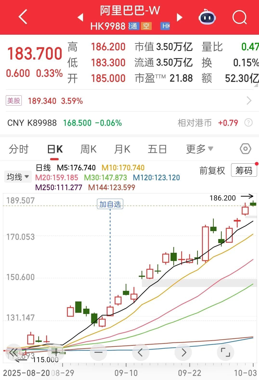 今日阿里巴巴股价再创近期新高。截至发稿,报183.7港元/股,市值约为3.5万亿港元。