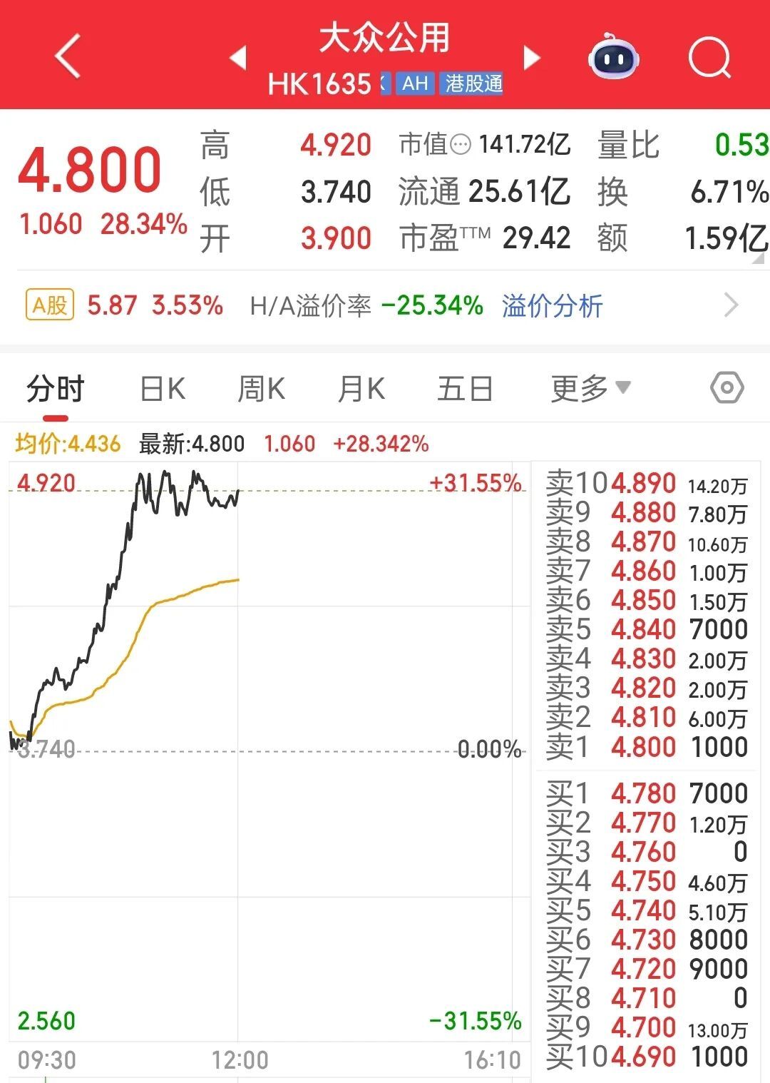 港股大众公用股价一度涨超30%,盘中最高见4.92港元,创历史新高。消息面上,大众公用此前在互动平台表示,公司参股深创投,深创投及其基金持有宇树科技股份。据悉,宇树科技预计于今年四季度向证券交易所提交上市申请文件。