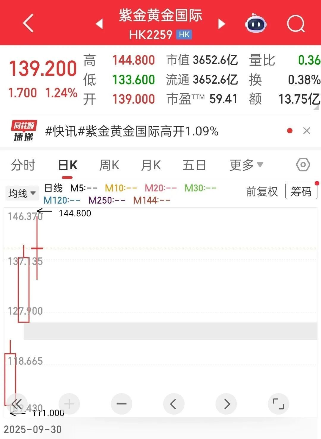 值得一提的是,紫金黄金国际(02259.HK)今日股价再创新高,截至发稿,报139.2港元/股,市值约为3652.6亿港元。