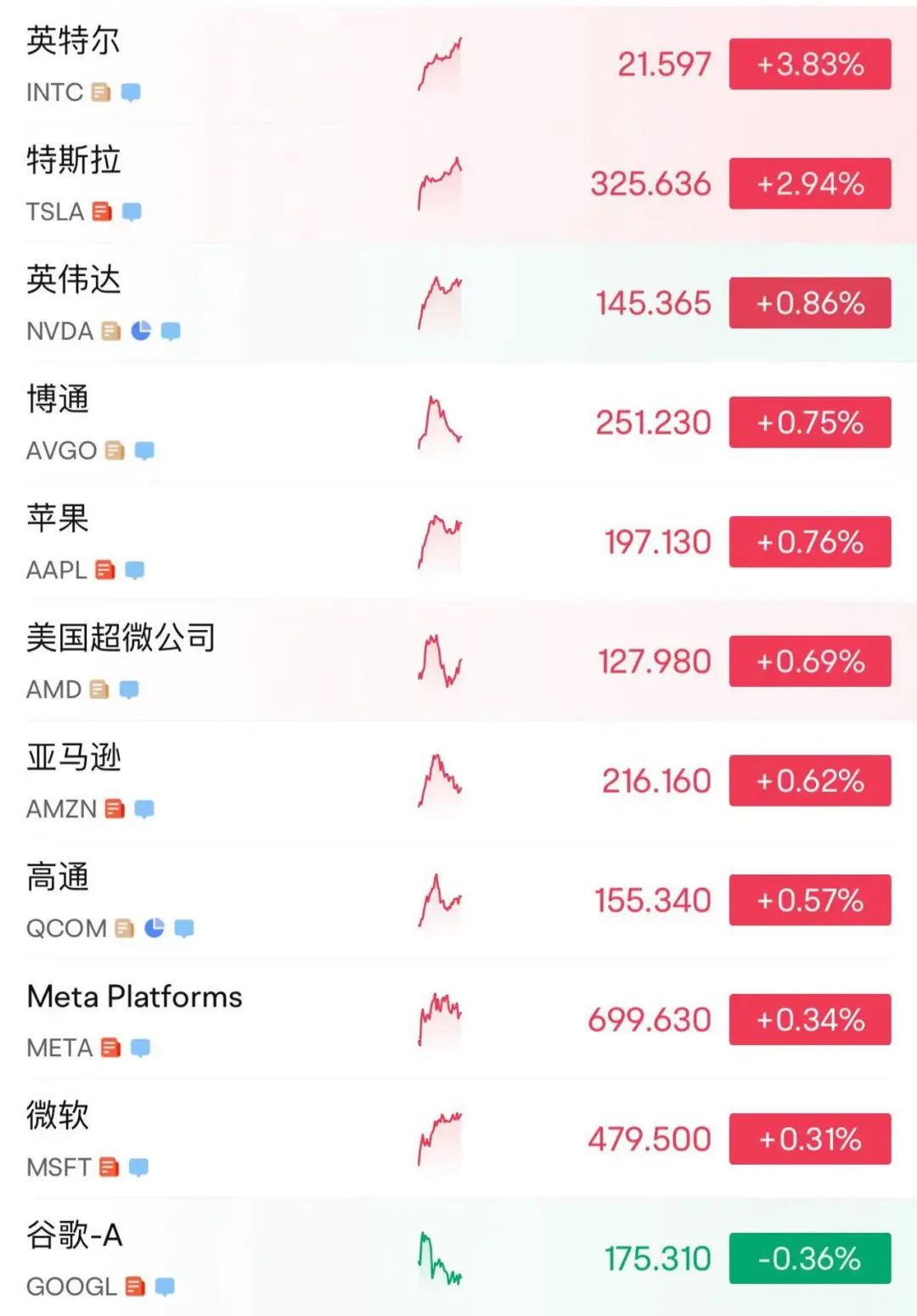 大型科技股多数上涨,截至发稿,英特尔涨3.83%,特斯拉涨2.94%,英伟达、博通、苹果、美国超微公司、亚马逊、高通、Meta、微软小幅上涨。谷歌A下跌。