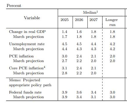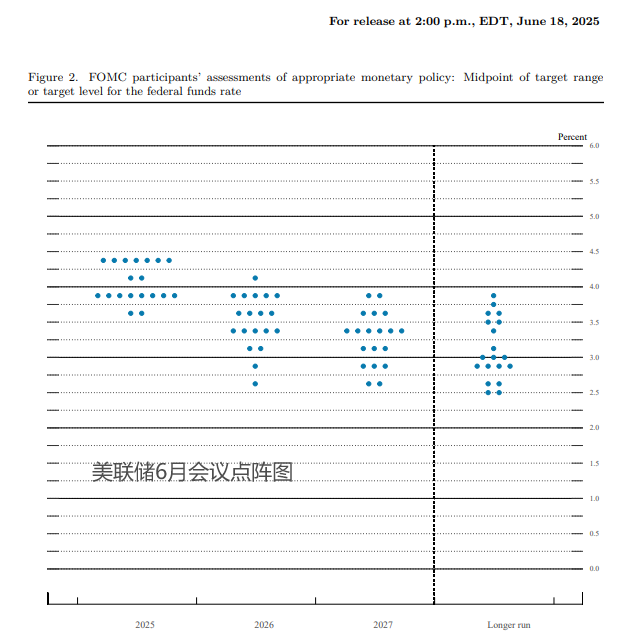 “点阵图”还显示,2026年底时的利率预期的中位数落在3.50%至3.75%之间,3月会议时为3.25%至3.50%。这意味着他们三个月前认为2026年将降息50个基点,现在变为降息25个基点。